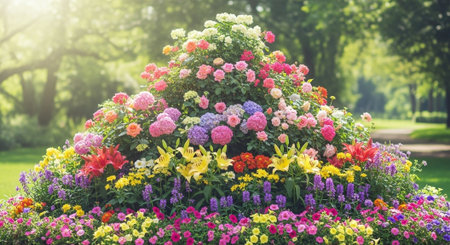 Beautiful flowerbed in park, vibrant colors under sunlight backdrop