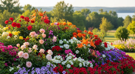 Vibrant flowerbed with colorful lilies roses and petunias