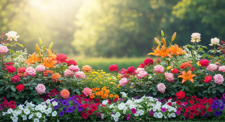 Vibrant flowerbed filled with roses and lilies in garden