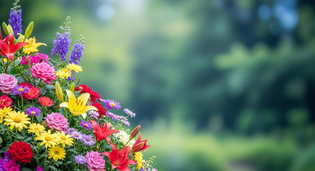 Vibrant flowerbed with colorful flowers and green background