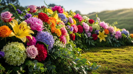Vibrant flowerbed bursting with colorful blossoms in idyllic landscape