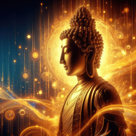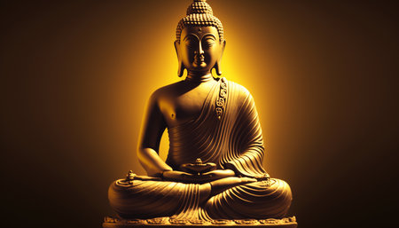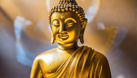 Captivating golden statue of the Buddha exudes tranquility as the soft glow of a radiant halo illuminates the surrounding warm hues, inviting inner reflection and calm.