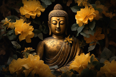 Buddha statue with yellow flowers and leaves on black background.