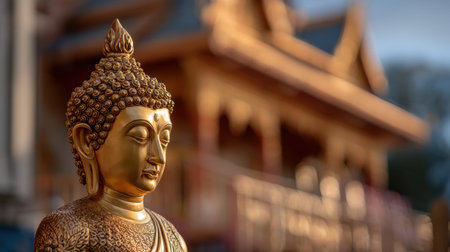 Serene Golden Buddha Statue in Outdoor Setting Bathed in Soft Natural Light with Spiritual Atmosphere and Tranquil Background Enhancing Inner Peace