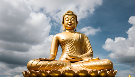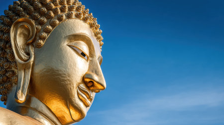 Golden Buddha statue serene expression blue sky background religious symbol cultural heritage peaceful atmosphere spiritual art close up view intricate details tranquility