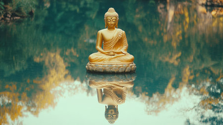 Golden Buddha statue with a reflection in a calm water pond, surrounded by nature, peaceful and serene