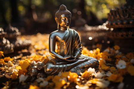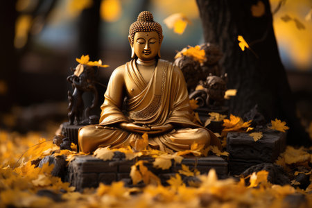 Buddha enlightened under golden tree, surrounded by symbols and serene nature., generative AI