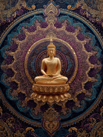 This captivating image features a golden Buddha sculpture set against a vibrant mandala background. It embodies tranquility and spirituality, making it perfect for meditation spaces.