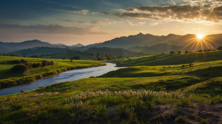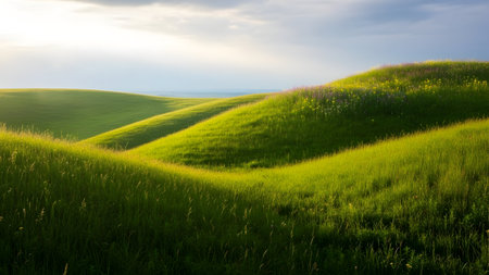 Rolling green hills bathed in sunlight with blooming wildflowers under a cloudy sky. Picturesque landscape captures natural beauty and peaceful atmosphere