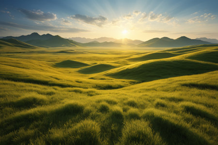 Golden sunset light bathes rolling green hills, creating undulating waves of color. A blue sky with scattered clouds stretches above the expansive, serene landscape.