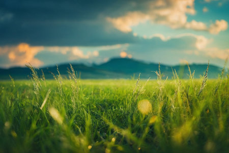 Green grass meadow on hill nature summer landscape abstract background. Generative ai.