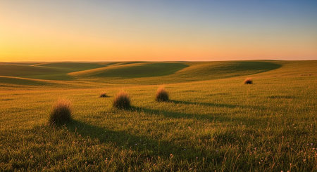 A wide expanse of lush green grass stretches to the horizon under a clear blue sky with soft sunlight illuminating the scene.