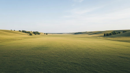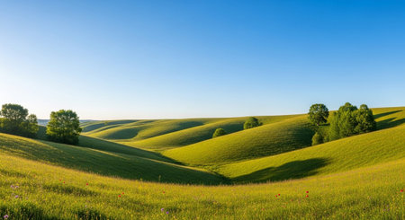 Vast green rolling hills stretch towards the horizon under a pale blue sky with soft clouds. Scattered trees dot the landscape, creating a serene and open natural...