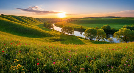 Cinematic view of rolling green hills adorned with vibrant wildflowers at golden hour