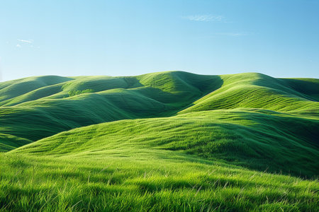 A vast expanse of gently rolling green hills creates a landscape under a bright blue sky dotted with fluffy white clouds. The undulating curves of the hills are accentuated by the interplay of light and shadow, highlighting their smooth, organic forms. The grass is a vibrant green, suggesting a healthy and fertile environment. This serene and picturesque scene evokes a sense of peace and natural beauty, a tranquil outdoor setting.