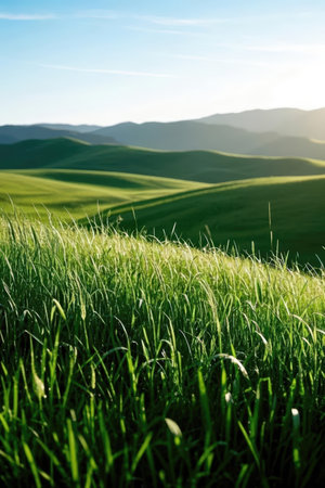 A breathtaking view of rolling hills reflecting nature's serenity, showcasing vibrant green grass and a clear blue sky scattered with soft, wispy clouds.