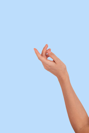 Human hand positioned as if holding object against plain blue background