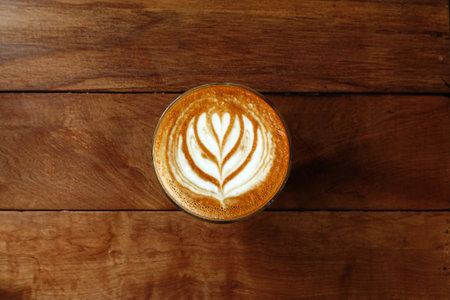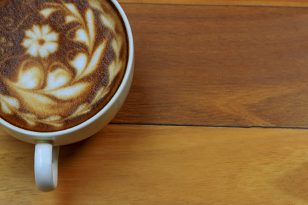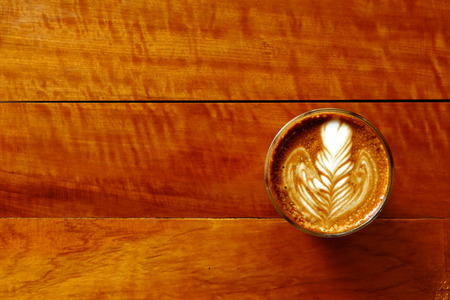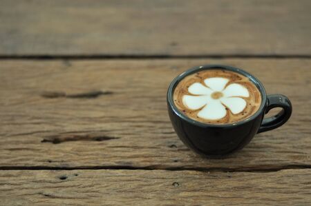 Hot coffee latte art decorated on wooden background.