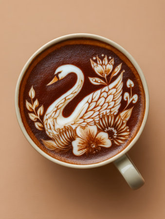 A delicate foamy swan gracefully curves within a mug, accented by hand-crafted floral patterns, creating an elegant harmony of artistry and warmth.