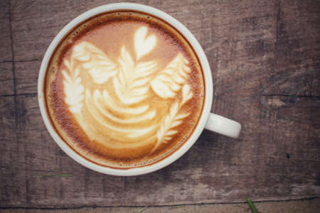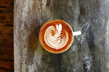 Coffee cup with latte art on old table
