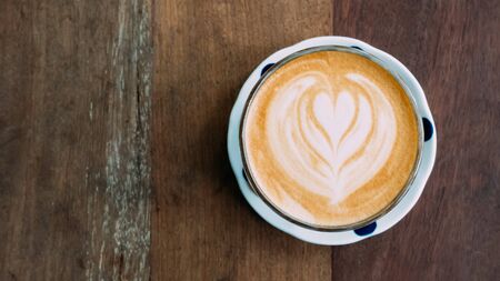 Top view of hot latte coffee on old wood table background with copy space.