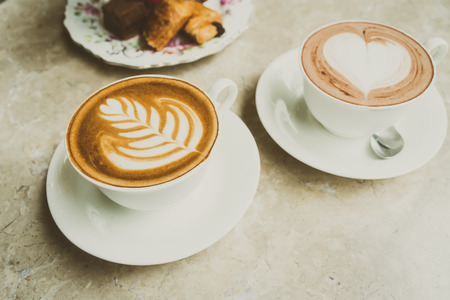 Two cups of cappuccino with latte art