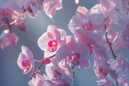 Delicate pink orchid flowers beautifully arranged against a soft blue background create a serene and elegant atmosphere, perfect for nature lovers.