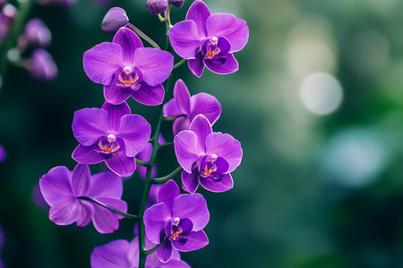 A stunning branch of purple orchids showcases its vibrant blooms and delicate buds, set against a soft green background, capturing the essence of natural beauty.