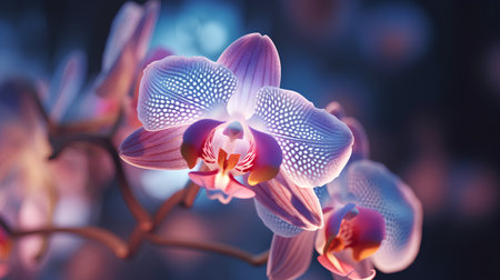 delicate pink Orchid with dew drops close up on blue background in neon light