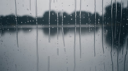 Water droplets and streaks run down a glass surface, obscuring a blurred background of trees and a lake under an overcast sky.