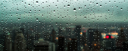 Raindrops cascading on a window with blurred city lights in the background, moody weather, capturing the essence of a rainy urban night