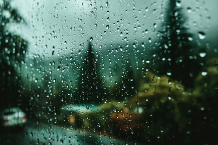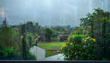 Raindrops Glisten on Window Panes, Framing a Serene View of Lush Green Trees and Cozy Homes Beyond