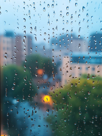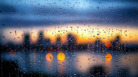 Raindrops patterning against a windowpane, creating a blurred cityscape beyond, offering a moment of reflection amid the urban clamor.. AI generated.
