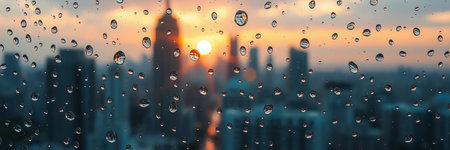 Beautiful sunset viewed through a rain-soaked window highlighting urban skyline and warm colors at dusk