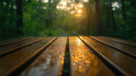 A wooden bridge glistens with raindrops, capturing the essence of a tranquil moment in nature. The vivid greenery frames a breathtaking, serene outdoor scene.