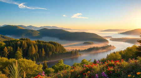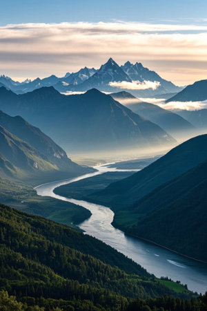 A winding river flows through a lush valley surrounded by mountains and fog at dawn. The soft light illuminates the greenery and brings a peaceful atmosphere to the scene.