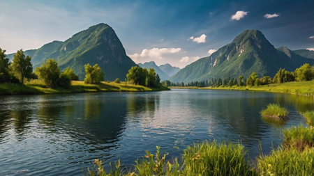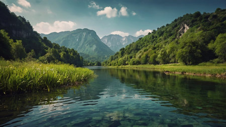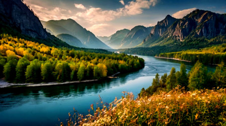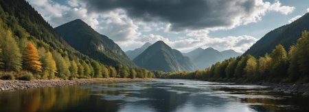 Beautiful mountain landscape with river and clouds in the sky. Artistic style.