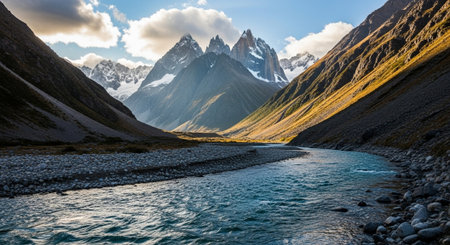 Beautiful mountain landscape with river and snow-capped peaks in the background