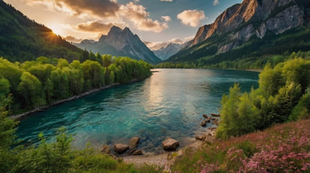 Mountain lake at sunset. Beautiful summer landscape with a mountain lake.