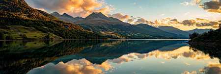 Panoramic view of beautiful alpine lake in autumn at sunset