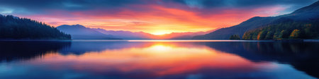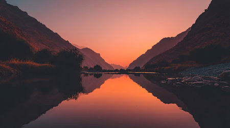 Vibrant sunset over a calm river reflects the majestic mountains in this peaceful outdoor scene. A perfect moment for nature lovers and photographers.