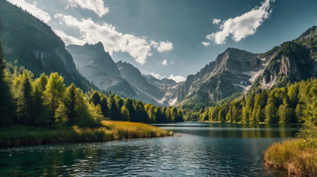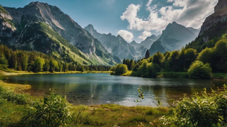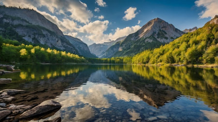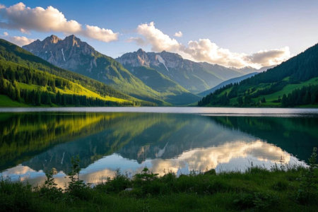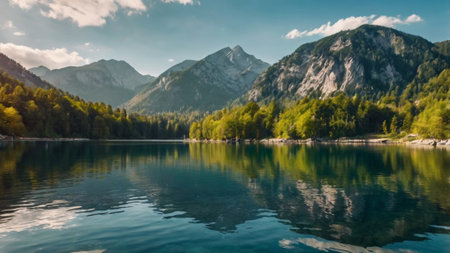 Nestled within towering mountains, this crystal-clear lake mirrors the surrounding nature, creating a breathtaking vista that highlights the beauty of tranquil waters and lush greenery.