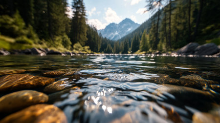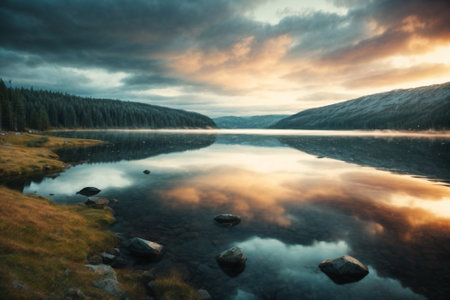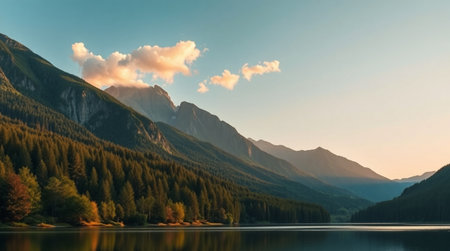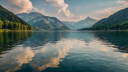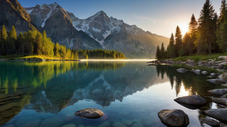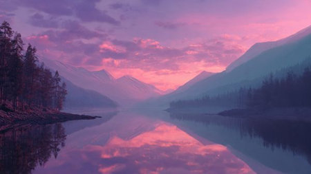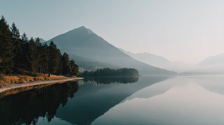 A serene mountain lake at dawn background with calm waters, rising mist, and the textures of rugged peaks and tranquil reflections, creating a peaceful and majestic natural scene.