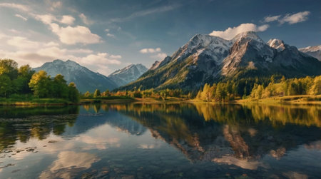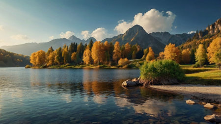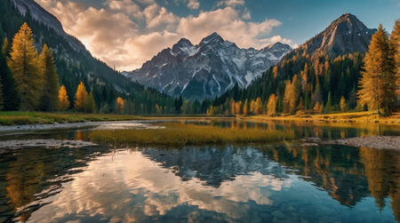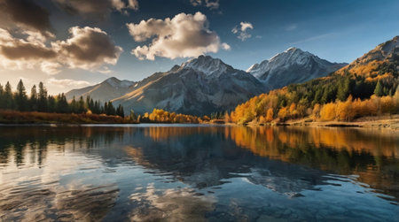 Mountain lake at sunset with reflection in water. Colorful autumn landscape. Generative AI