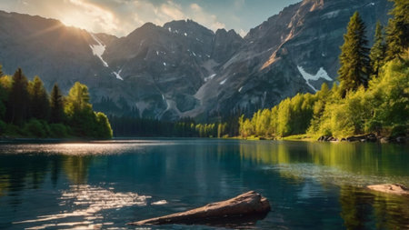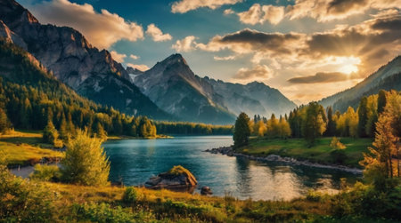 Tranquil sunset scene in the mountains. Serene lake reflects the sun setting behind the rocky peaks. A warm and picturesque glow