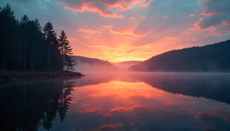 Discover the tranquil beauty of a serene forest lake, surrounded by towering evergreen trees and enveloped in mysterious fog. This peaceful scene invites reflection and relaxation in a captivating natural environment rich in greenery and calm waters.