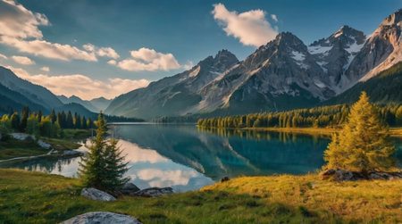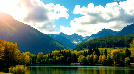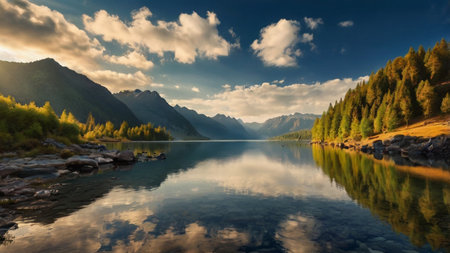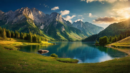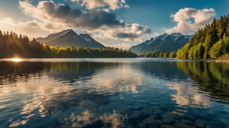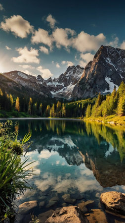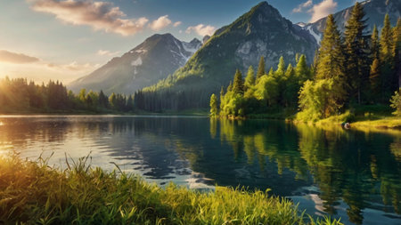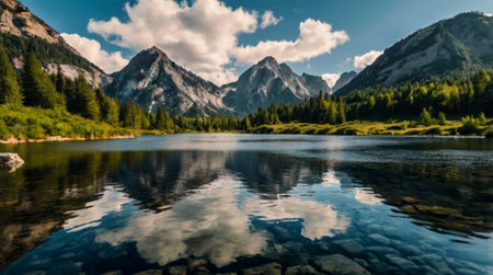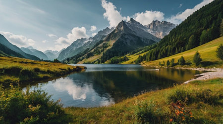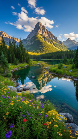 Fluffy showing mountain peak reflected in a crystal clear alpine lake surrounded by lush green pine forests and vibrant wildflowers under a blue sky with fluffy...
