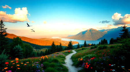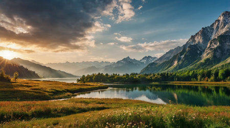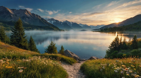 Beautiful landscape with mountain lake and wildflowers at sunset.