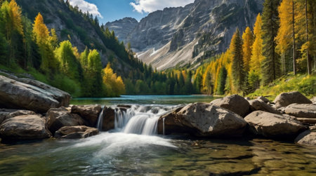 Autumn alpine mountain landscape. Small waterfall on the mountain river.
