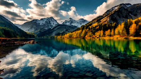 Beautiful alpine lake with reflection of mountains and sky in autumn